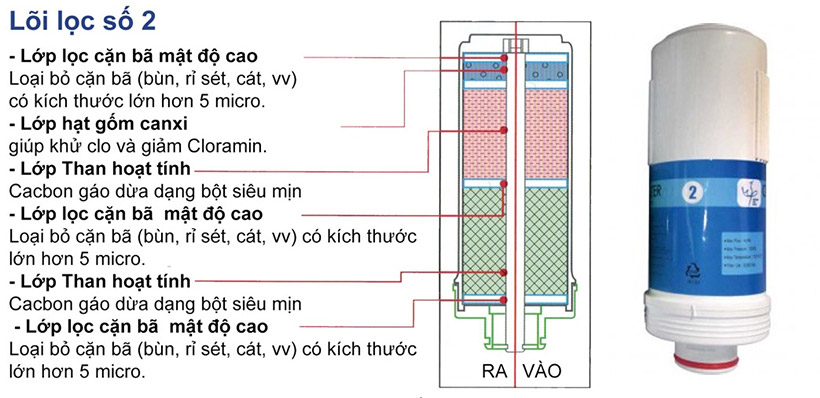 Hệ thống lọc gồm 2 lõi lọc với công suất lọc tối đa 4L/ phút, giúp lọc hầu hết các tạp chất, kim loại nặng, chất hữu cơ, clo, màu, mùi, chất ô nhiễm... giữ khoáng, diệt khuẩn bằng đèn UV. Máy có chức năng hiển thị tuổi thọ lõi lọc trong quá trình sử dụng.