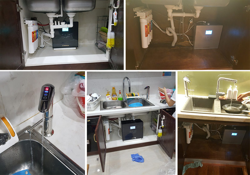 Ngoài ra bạn cũng có thể lắp đặt máy ngay dưới chậu, bồn rửa tích hợp với bộ vòi điện tử để ấn chọn các loại nước trực tiếp trên vòi.