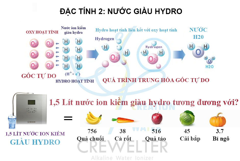 Hydro được coi là nguyên tố có tác dụng trong việc loại bỏ thành công các gốc tự do trong cơ thể, nguyên nhân chính gây ra hiện tượng lão hóa. Thông thường khí hydro không hòa tan được trong nước, chúng rất dễ bay hơi do nhẹ hơn nước. 1 lit nước lạnh 2oC chỉ có thể hòa tan được 1,6mg hydro. Nước ion kiềm giàu hydro được tạo ra nên được sử dụng ngay sau khi lấy ra khỏi máy là bởi vì lý do này.